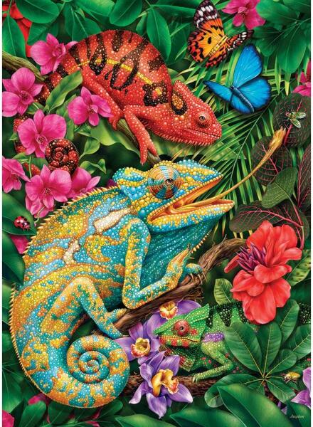 A kanadai Cobble Hill  a nosztalgikus, színes, és mindemellett kiváló minőségű kirakókkal kívánja örvendetessé tenni a játék élményt kicsiknek és nagyoknak egyaránt.  A Cobble Hill 1000 db-os puzzle - Karma Chameleon (40299)  kirakó egy színes és vidám kirakó, amely a karneváli és szórakoztató hangulatot hozza el. A középpontban egy színes kaméleon áll.