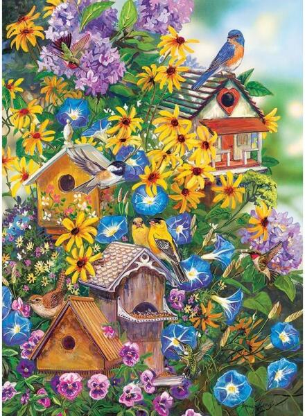 Ünnepeld a nyarat a Cobble Hill 500 db-os puzzle - Summer Bounty kirakóval! Színpompás virágok és madarak veszik körül a bájos kis madáretetőket, szinte érezni a virágok illatát és hallani a madarak dalát. A kirakó nagy méretű darabjainak köszönhetően ideális kicsiknek és nagyoknak, illetve azoknak, akik ritkán kirakóznak.