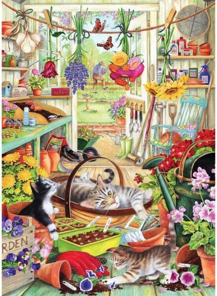 A rendetlen kiscicák vidáman játszanak egy virágos kertészeti fészerben a Cobble Hill 45115 - Potting Shed Cats - 500 db-os puzzle képén.  Kellemes, otthonos témájú puzzle macskarajongóknak.
