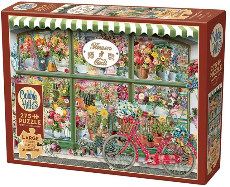A Cobble Hill 275 db-os puzzle - Flowers and Cacti Shop Láttál már ilyen szép és színes Virág- és Kaktuszboltot? Egy piros pöttyös kerékpár friss virágkosárral parkol a kedves kirakat előtt. A Cobble Hill Easy Handling 275 darabos, véletlenszerűen kivágott kirakói tökéletes kezdőrejtvények minden újonc számára a szúrófűrészek terén. A nagy darabok rengeteg részletet mutatnak be, így könnyebben azonosítható a helye a kirakós játékban. Az átlagos darabméret két hüvelyk. Időseink szívesen összeállítják ezeket a rejtvényeket önállóan és unokáikkal, ez nagyszerű tevékenység minden korosztály számára! Ez is egy könnyű kategória egy otthoni randevús estéhez!