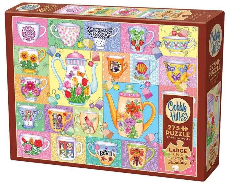 A kanadai Cobble Hill  a nosztalgikus, színes, és mindemellett kiváló minőségű kirakókkal kívánja örvendetessé tenni a játék élményt kicsiknek és nagyoknak egyaránt.  A Cobble Hill 275 db-os Easy Handling puzzle - Which Cup (48027) képén gyönyörű csészék és kancsók láthatóak. Te melyiket választanád?A Cobble Hill Easy Handling 275 darabos , véletlenszerűen kivágott kirakói tökéletes kezdőrejtvények minden újonc számára. A nagy darabok rengeteg részletet mutatnak be, így könnyebben azonosítható a helye a kirakós játékban. Az átlagos darabméret két hüvelyk. Időseink szívesen összeállítják ezeket a rejtvényeket önállóan és unokáikkal, ez nagyszerű tevékenység minden korosztály számára! Ez is egy könnyű kategória egy otthoni randevús estéhez!