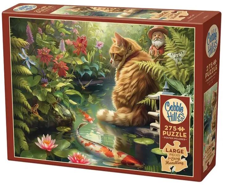 A kanadai Cobble Hill  a nosztalgikus, színes, és mindemellett kiváló minőségű kirakókkal kívánja örvendetessé tenni a játék élményt kicsiknek és nagyoknak egyaránt.  A Cobble Hill 275 db-os Easy Handling puzzle - Koi Cat (48030) képe mesés hangulatot áraszt. Egy cuki cica látható a képen. A Cobble Hill Easy Handling 275 darabos , véletlenszerűen kivágott kirakói tökéletes kezdőrejtvények minden újonc számára. A nagy darabok rengeteg részletet mutatnak be, így könnyebben azonosítható a helye a kirakós játékban. Az átlagos darabméret két hüvelyk. Időseink szívesen összeállítják ezeket a rejtvényeket önállóan és unokáikkal, ez nagyszerű tevékenység minden korosztály számára! Ez is egy könnyű kategória egy otthoni randevús estéhez!