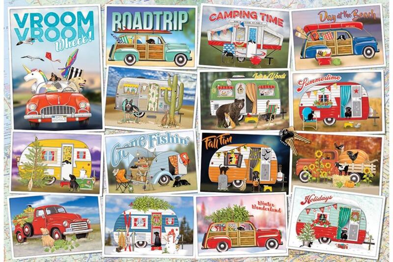 A Cobble Hill 2000 db-os puzzle - Vroom Vroom  című képen képen tizenöt képeslapjelenetet láthatunk egy kollázsban az autóban való utazás örömét ábrázolva minden évszakban!