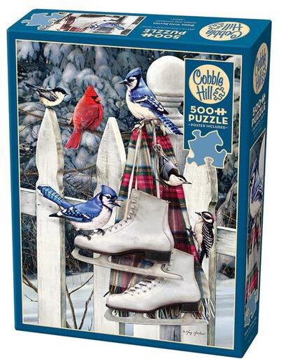 A Cobble Hill 500 db-os puzzle - Birds with Skates (45071) Ez a 500 darabos puzzle egy bájos és játékos téli jelenetet ábrázol, ahol különböző madarak korcsolyáznak a jégpályán. A madarak színes és vidám öltözet viselnek, mindegyik saját stílusában próbálja ki a korcsolyázást. A háttérben havas táj és téli hangulat uralkodik, amely további varázslatot ad a képeslapra emlékeztető jelenethez.