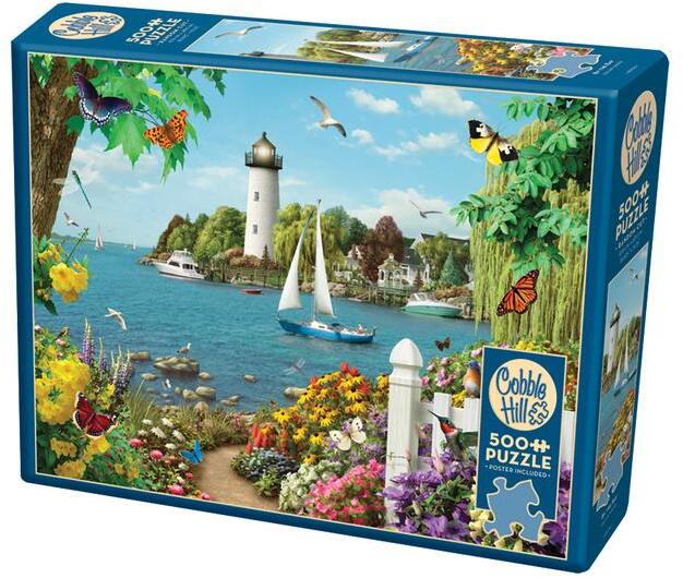 A kanadai Cobble Hil l  a nosztalgikus, színes, és mindemellett kiváló minőségű kirakókkal kívánja örvendetessé tenni a játék élményt kicsiknek és nagyoknak egyaránt.  A  Cobble Hill 500 db-os puzzle - By the Bay (45062) kirakón egy kis öböl látható, ahol található egy világítótorony és egy kikötő. A nyugodt kikötőt az elsuhanó vitorlás hajó zavarja meg.