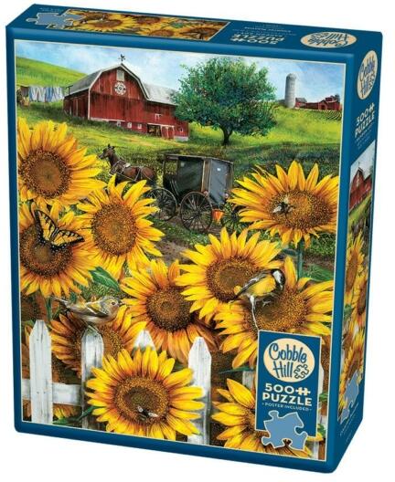 A kanadai Cobble Hil l  a nosztalgikus, színes, és mindemellett kiváló minőségű kirakókkal kívánja örvendetessé tenni a játék élményt kicsiknek és nagyoknak egyaránt.  A Cobble Hill 500 db-os puzzle - Country Paradise (45069) kirakó egy vidéki paradicsomot ábrázol, ahol a gyönyörű napraforgók napozóhelyet biztosítanak a pillangóknak, madaraknak és dongóknak.