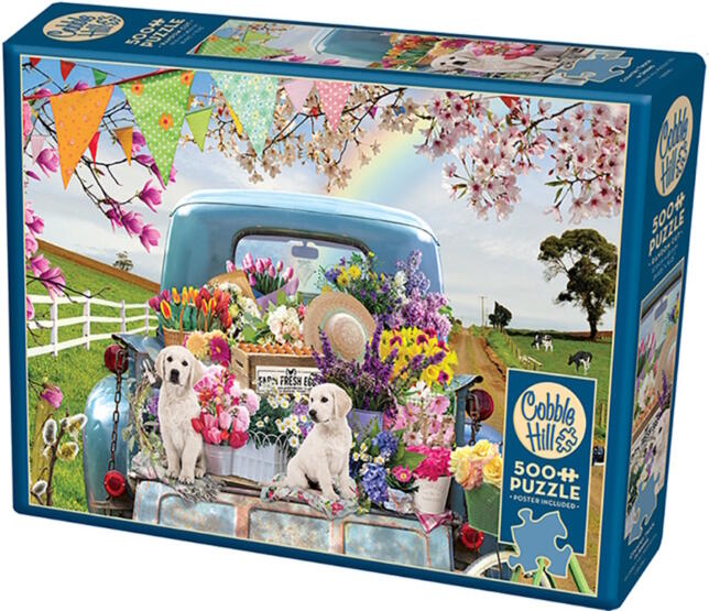 A kanadai Cobble Hil l  a nosztalgikus, színes, és mindemellett kiváló minőségű kirakókkal kívánja örvendetessé tenni a játék élményt kicsiknek és nagyoknak egyaránt.  A Country Truck in Spring - 500 db-os kirakón egy igazi tavaszi, színekkel teli kép található. Tele van gyönyörű virágokkal és imádni való kutyusokkal. A puzzle vidám hangulata magával ragadja a kirakó szerelmeseit.