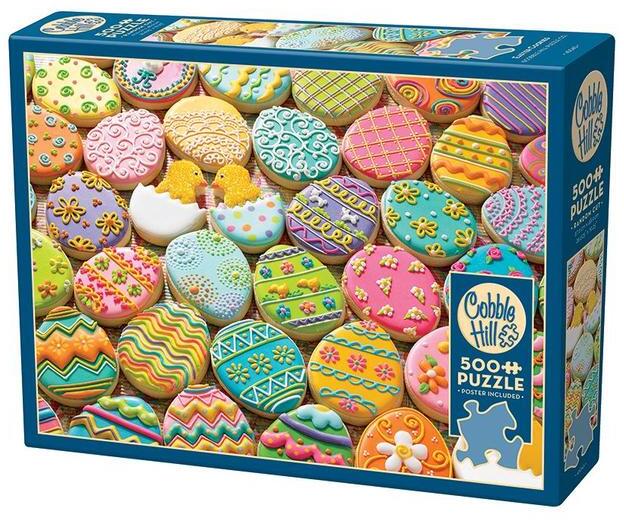 A kanadai Cobble Hil l  a nosztalgikus, színes, és mindemellett kiváló minőségű kirakókkal kívánja örvendetessé tenni a játék élményt kicsiknek és nagyoknak egyaránt.  A tavasz a levegőben van, közeledik a Húsvét. A  Cobble Hill 500 db-os puzzle - Easter Cookies (45043) kirakón Húsvét témájú sütik láthatóak, amik gyönyörűen vannak díszítve különböző motívumokkal és eltérő színekkel.