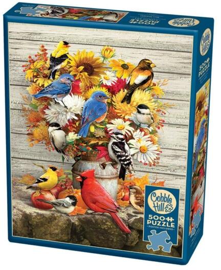 A kanadai Cobble Hil l  a nosztalgikus, színes, és mindemellett kiváló minőségű kirakókkal kívánja örvendetessé tenni a játék élményt kicsiknek és nagyoknak egyaránt.  Ezen a  Cobble Hill 500 db-os puzzle - Fall Harvest (45039) kirakón látható az őszi szüret eredménye, egy szép, nagy csokor és egy sereg madárka. Bármelyik szoba falán jól mutat!