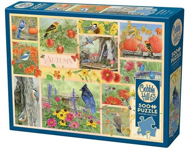 A kanadai Cobble Hil l  a nosztalgikus, színes, és mindemellett kiváló minőségű kirakókkal kívánja örvendetessé tenni a játék élményt kicsiknek és nagyoknak egyaránt.  A Cobble Hill 500 db-os puzzle - Garden Birds in Autumn (45103) egy lenyűgöző és élénk színvilágú kirakó, amely az őszi kertben megjelenő madarak szépségét ünnepli