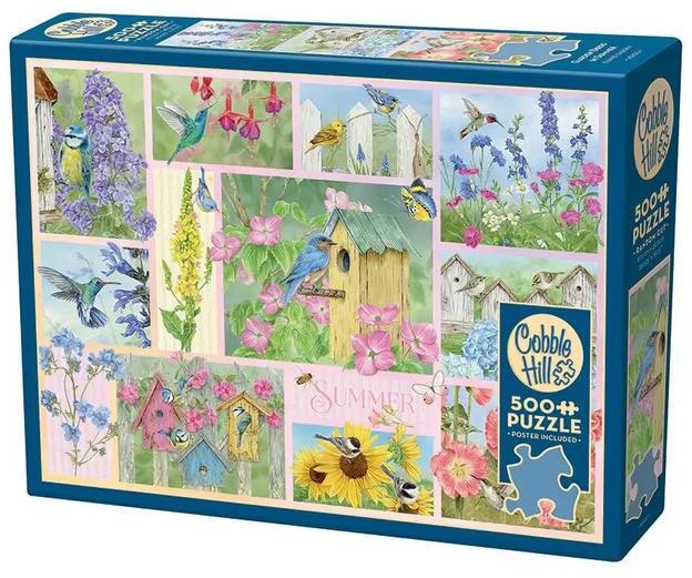 A kanadai Cobble Hil l  a nosztalgikus, színes, és mindemellett kiváló minőségű kirakókkal kívánja örvendetessé tenni a játék élményt kicsiknek és nagyoknak egyaránt.  A Cobble Hill 500 db-os puzzle - Garden Birds in Summer (45102) egy lenyűgöző és élénk színvilágú kirakó, amely a nyári kertben megjelenő madarak szépségét ünnepli