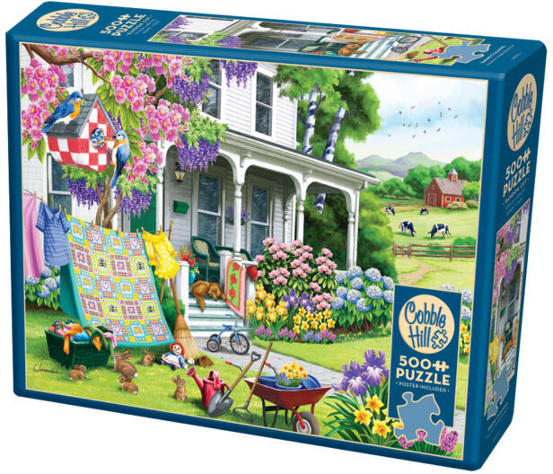A kanadai Cobble Hil l  a nosztalgikus, színes, és mindemellett kiváló minőségű kirakókkal kívánja örvendetessé tenni a játék élményt kicsiknek és nagyoknak egyaránt.  A Spring Cleaning - 500 db-os kirakó egy farmot ábrázol, hol egy tavaszi, nagy takarítás zajlik éppen. Az állatkák a természetben játszanak, élvezik a tavasz első napsugarait.
