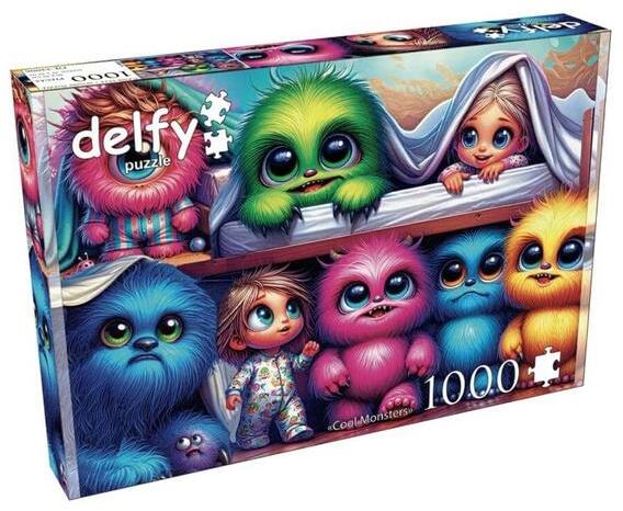 Vidám, barátságos szörnyecskék bújtak az ágyadba, még jó, hogy tőlük nem kell félni! A Delfy 1000 db-os puzzle - Cool monsters (DE-24006)  jelenete egyszerre humoros és bájosan hóbortos.