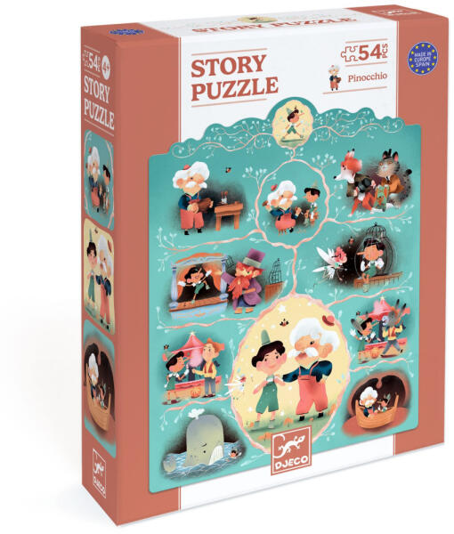 A Djeco új "Story puzzle" sorozat egyik tagja az 54 darabos Pinokkió Egy felejthetetlen klasszikus mese új köpenyben: a pajkos Pinokkió és társai néma képregényszerű megjelenítése. Remek szórakozás a kép összeállítása és a történet elmondása, dramatizálása újra és újra... A doboz 3 karakterkártyát is tartalmaz, melyek különleges kiegészítői lehetnek a mesemondásnak, szerepjátéknak. 4 éves kortól ajánlott. A terméket Spanyolországban gyártották, FSC tanúsítvánnyal rendelkező kartonból készült. Tartalom :