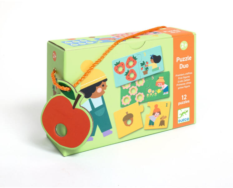 A Duo Puzzle sorozat új tagja az első számok párosító puzzle 2 éves kortól A Djeco Duo Puzzle sorozata kifejezetten a legkisebbeknek készült első párosító puzzle különböző témákban. A párosító játék az alkotás öröme mellett segít a kicsiknek összefüggések megértésében, felidézésében. A nagyobb darabokat az apró kezecskékkel könnyebb megfogni, összeilleszteni. A First Figures készletben 12 képes kirakót kell összeilleszteni 2-2 darabból. Hány makkot talált a mókus? mennyi halacskát lát a kisfiú? Hány alma van a talicskában? Első ismerkedés a számokkal 1-6 számkörben, fejleszti a számolási készséget, segít a számfogalom, számállandóság kialakulásában. Tartalma: