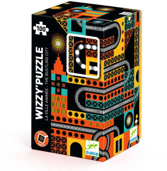 Optikai puzzle: minden mozgásban látható. Egy varázslatos, 100 darabból álló puzzle, amely a WIZZY' puzzle család izgalmas része. Ha elkészült a kirakott kép, a gyermek a vonalazott varázsfóliát mozgatja a rajz fölött... Lenyűgöző: a város életre kel!WIZZY' puzzle új puzzle családnév a Djeco-nál. Ez egy hagyományos puzzle nagy csavarral, valamilyen plusz látvánnyal gyarapodnak a képek a kirakás után: az egyik tündököl, a másik a sötétben foszforeszkálva világít, a harmadiknál nagy meglepést él át, aki megnézi a kész képet a bűvös vonalazott fóliával... Tartalma: