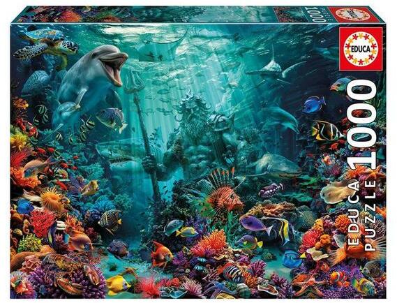 Színes halak, vidám delfinek és hátborzongató cápák töltik meg élettel az Educa 1000 db-os puzzle - Poszeidon korallzátony (20174) című képét.
