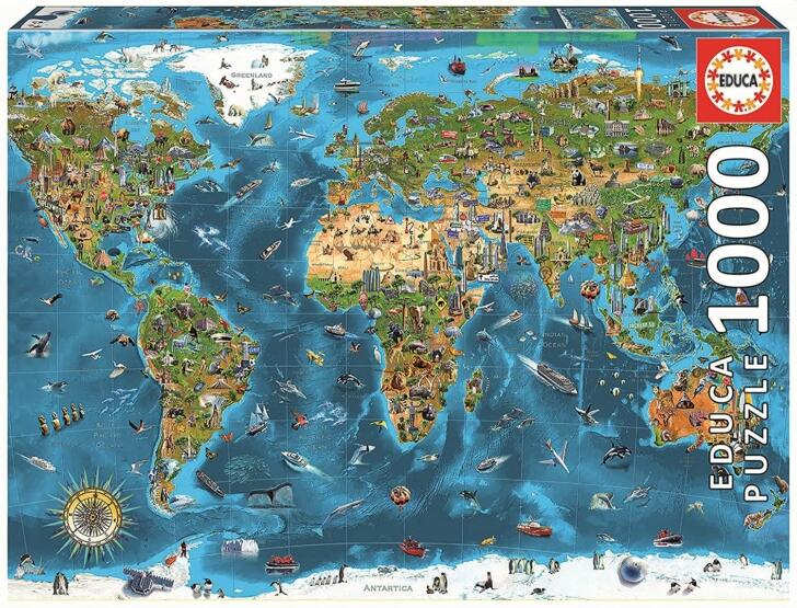 Az Educa garantálja a prémium minőséget és minden 500, 1000, 1500 és 2000 darabos puzzle terméke mellé Puzzle-fix ragasztót ad ajándékba, mellyel az elkészült kép rögzíthető. Educa - 1000 db-os puzzle - Világtérkép (19022) a kirakott képen A  Földről láthatunk egy csodálatos képet, a kontinensekkel, és azon élő állatokkal.