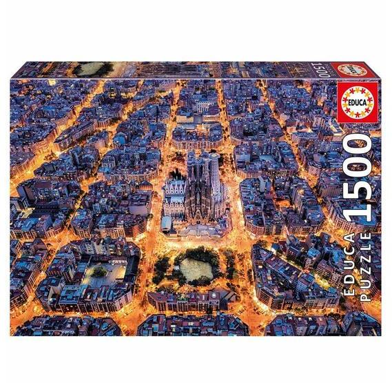 Vessz el a város éjszakai forgatagában az Educa 1500 db-os puzzle - Barcelona (20285) kirakóval! Középen a Sagrada Família, és esti fényekkel kivilágított utcák, ameddig a szem ellát.