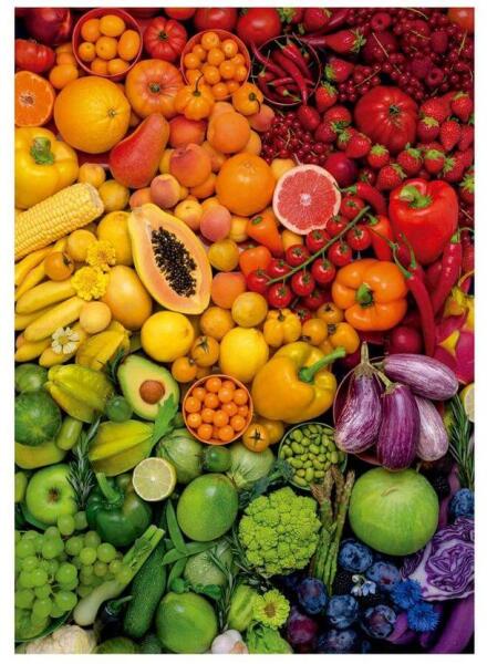 Az Educa 1000 db-os puzzle - Színes vitaminbombák (20178) című kirakó képén guszta gyümölcsöket és zöldségeket láthatunk a szivárvány minden színében.