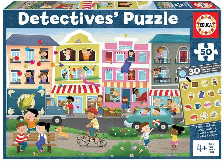 Az Educa gyerekeknek készült kirakói kiváló minőséget képviselnek széles választékban. A detektív puzzle doboza egy kis táblát is tartalmaz, amin azok a dolgok találhatók, amit a kirakott képen kell keresni.