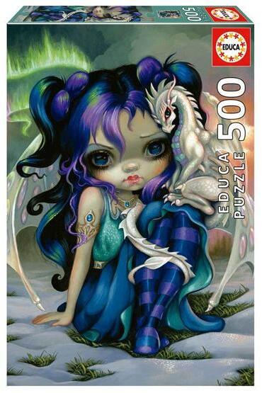 Az Educa 500 db-os puzzle - Sárkánytündér (19906) kirakó Jasmine Becket-Griffith Frost Dragonling grafikája nyomán készült. A kép egy cuki kis sárkánytündért és az ő kis sárkányát ábrázolja, háttérben a sarki fénnyel.