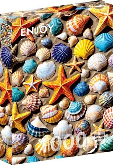 Az új technológiának köszönhetően az Enjoy Puzzle termékeknél ne aggódjon amiatt, hogy az összerakott részek szétesnek, amikor mozgatja őket, mivel a darabok szorosan és egyenletesen kapcsolódnak egymáshoz. Az aprócska puzzle darabokat bevonó sima, matt, tükröződésmentes felület minden zavaró árnyékot és oda nem illő fénylést eltűntet. Bármilyen fényviszonyok között, nappal és éjszaka is kirakható! A változatos formájú és könnyen észrevehető sajátosságok miatt a darabokat lehetetlen összetéveszteni. Enjoy 1000 db-os puzzle - Beach Treasure (2160) a kirakott képén egy gyönyörű tengerparti jelenetet ábrázol, ahol a homokon különféle kagylók sorakoznak. A kagylók különböző formákban és színekben és homokkal együtt alkotnak lenyűgöző látványt.