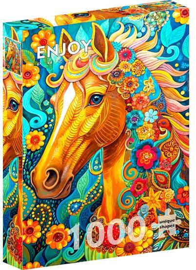 Az  Enjoy 1000 db-os puzzle - Blooming Mane (2256) című kép egy virágokkal díszített, színes sörényű lovat ábrázol.