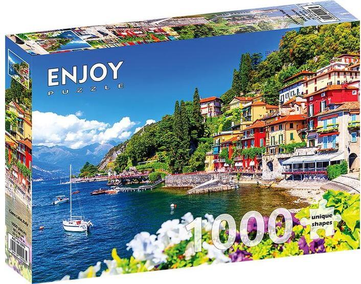 Az új technológiának köszönhetően az Enjoy Puzzle termékeknél ne aggódjon amiatt, hogy az összerakott részek szétesnek, amikor mozgatja őket, mivel a darabok szorosan és egyenletesen kapcsolódnak egymáshoz. Az aprócska puzzle darabokat bevonó sima, matt, tükröződésmentes felület minden zavaró árnyékot és oda nem illő fénylést eltűntet. Bármilyen fényviszonyok között, nappal és éjszaka is kirakható! A változatos formájú és könnyen észrevehető sajátosságok miatt a darabokat lehetetlen összetéveszteni. Enjoy 1000 db-os puzzle - Como Lake, Italy (2093) - Az 1000 darabból álló puzzle az észak-olaszországi Como-tavat ábrázolja, mely az Alpok lábainál fekszik. A puzzle bemutatja a tó kristálytiszta vizét, körülötte a hegyeket és a hangulatos olasz falvakat.