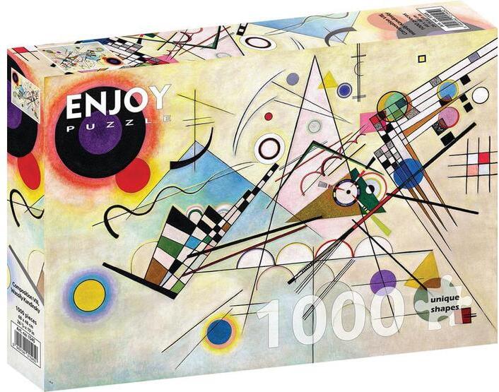 Az új technológiának köszönhetően az Enjoy Puzzle termékeknél ne aggódjon amiatt, hogy az összerakott részek szétesnek, amikor mozgatja őket, mivel a darabok szorosan és egyenletesen kapcsolódnak egymáshoz. Az aprócska puzzle darabokat bevonó sima, matt, tükröződésmentes felület minden zavaró árnyékot és oda nem illő fénylést eltűntet. Bármilyen fényviszonyok között, nappal és éjszaka is kirakható! A változatos formájú és könnyen észrevehető sajátosságok miatt a darabokat lehetetlen összetéveszteni. Az Enjoy 1000 db-os puzzle - Composition VIII, Wassily Kandinsky (1545) kirakó képén Wassily Kandinsky absztrakt alkotása látható.  Kandinsky olyan absztrakt nyelv megfogalmazására törekedett, amely ugyanúgy erős érzelmeket vált ki a közönségben, mint a zene.