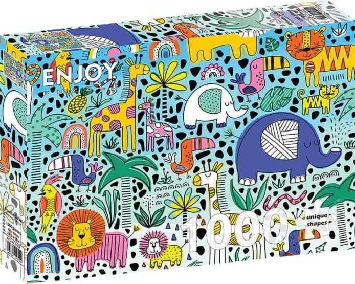 Az új technológiának köszönhetően az Enjoy Puzzle termékeknél ne aggódjon amiatt, hogy az összerakott részek szétesnek, amikor mozgatja őket, mivel a darabok szorosan és egyenletesen kapcsolódnak egymáshoz. Az aprócska puzzle darabokat bevonó sima, matt, tükröződésmentes felület minden zavaró árnyékot és oda nem illő fénylést eltűntet. Bármilyen fényviszonyok között, nappal és éjszaka is kirakható! A változatos formájú és könnyen észrevehető sajátosságok miatt a darabokat lehetetlen összetéveszteni. Enjoy 1000 db-os puzzle - Doodle Safari (1922) a kirakott képén egy szafari kalandot látunk. A dzsungelek, állatok és pálmafák kollázsa okoz fantáziadús és izgalmas puzzle-zési élményt.