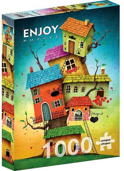 Az új technológiának köszönhetően az Enjoy Puzzle termékeknél ne aggódjon amiatt, hogy az összerakott részek szétesnek, amikor mozgatja őket, mivel a darabok szorosan és egyenletesen kapcsolódnak egymáshoz. Az aprócska puzzle darabokat bevonó sima, matt, tükröződésmentes felület minden zavaró árnyékot és oda nem illő fénylést eltűntet. Bármilyen fényviszonyok között, nappal és éjszaka is kirakható! A változatos formájú és könnyen észrevehető sajátosságok miatt a darabokat lehetetlen összetéveszteni. Enjoy 1000 db-os puzzle - Fairy Tale Houses (2119) a kirakott képén egy mesés képet ábrázol, melyen varázslatos, színes házak épültek egymás tetejére. A házak egyedi formájukkal és élénk színeikkel egy igazi mesevilágot teremtenek.