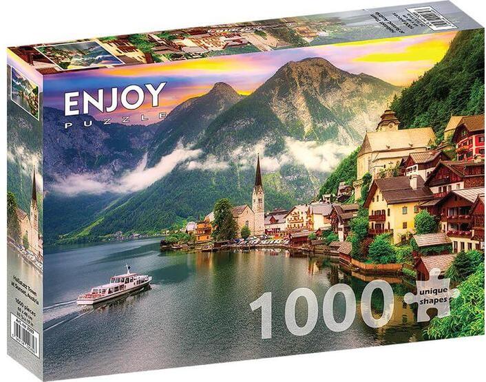 Az új technológiának köszönhetően az Enjoy Puzzle termékeknél ne aggódjon amiatt, hogy az összerakott részek szétesnek, amikor mozgatja őket, mivel a darabok szorosan és egyenletesen kapcsolódnak egymáshoz. Az aprócska puzzle darabokat bevonó sima, matt, tükröződésmentes felület minden zavaró árnyékot és oda nem illő fénylést eltűntet. Bármilyen fényviszonyok között, nappal és éjszaka is kirakható! A változatos formájú és könnyen észrevehető sajátosságok miatt a darabokat lehetetlen összetéveszteni. Enjoy 1000 db-os puzzle - Hallstatt Town at Sunset, Austria (2089) - Hallstatt Ausztria egyik legbájosabb városa, mely a Hallstätter-tó partján fekszik. Az 1000 darabból álló puzzle Hallstatt városképét, a tóparti házakat és a hegyek közé szorult falut ábrázolja a lenyugvó nap fényében.