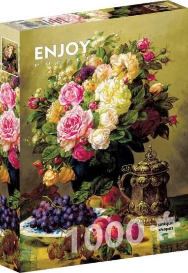 Az új technológiának köszönhetően az Enjoy Puzzle termékeknél ne aggódjon amiatt, hogy az összerakott részek szétesnek, amikor mozgatja őket, mivel a darabok szorosan és egyenletesen kapcsolódnak egymáshoz. Az aprócska puzzle darabokat bevonó sima, matt, tükröződésmentes felület minden zavaró árnyékot és oda nem illő fénylést eltűntet. Bármilyen fényviszonyok között, nappal és éjszaka is kirakható! A változatos formájú és könnyen észrevehető sajátosságok miatt a darabokat lehetetlen összetéveszteni. Az  Enjoy 1000 db-os puzzle - Jean-Baptiste Robie: Still Life with Roses (1107) kirakó képén Jean-Baptiste Robie művész olajfestményét láthatjuk.