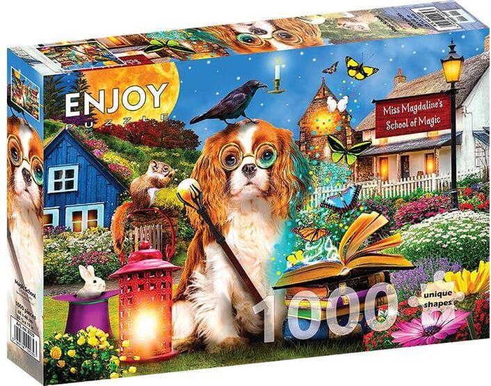 Az új technológiának köszönhetően az Enjoy Puzzle termékeknél ne aggódjon amiatt, hogy az összerakott részek szétesnek, amikor mozgatja őket, mivel a darabok szorosan és egyenletesen kapcsolódnak egymáshoz. Az aprócska puzzle darabokat bevonó sima, matt, tükröződésmentes felület minden zavaró árnyékot és oda nem illő fénylést eltűntet. Bármilyen fényviszonyok között, nappal és éjszaka is kirakható! A változatos formájú és könnyen észrevehető sajátosságok miatt a darabokat lehetetlen összetéveszteni.  Enjoy 1000 db-os puzzle - Magic School (2039) a kirakott képén egy gyönyörű Cavalier Spániel látható, amint barátai körülveszik.