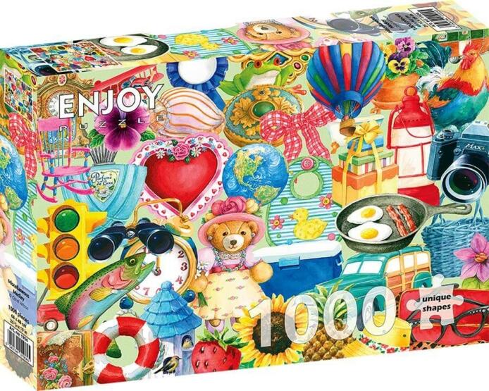 Az új technológiának köszönhetően az Enjoy Puzzle termékeknél ne aggódjon amiatt, hogy az összerakott részek szétesnek, amikor mozgatja őket, mivel a darabok szorosan és egyenletesen kapcsolódnak egymáshoz. Az aprócska puzzle darabokat bevonó sima, matt, tükröződésmentes felület minden zavaró árnyékot és oda nem illő fénylést eltűntet. Bármilyen fényviszonyok között, nappal és éjszaka is kirakható! A változatos formájú és könnyen észrevehető sajátosságok miatt a darabokat lehetetlen összetéveszteni. Enjoy 1000 db-os puzzle - Tea Time (1910) a kirakott képén vegyes motívumok sokasága jelenik meg, például serpenyő, játékmaci, hőlégballon stb. . Izgalmas és változatos kihívást kínálnak a puzzlezés szerelmeseinek.