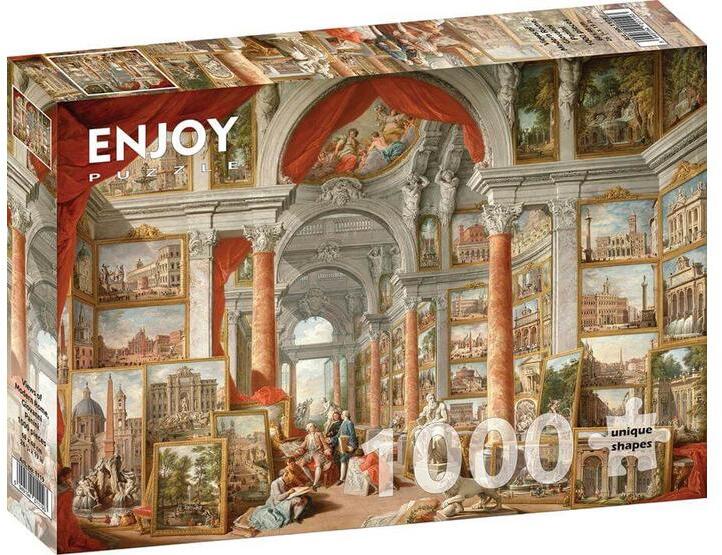 Az új technológiának köszönhetően az Enjoy Puzzle termékeknél ne aggódjon amiatt, hogy az összerakott részek szétesnek, amikor mozgatja őket, mivel a darabok szorosan és egyenletesen kapcsolódnak egymáshoz. Az aprócska puzzle darabokat bevonó sima, matt, tükröződésmentes felület minden zavaró árnyékot és oda nem illő fénylést eltűntet. Bármilyen fényviszonyok között, nappal és éjszaka is kirakható! A változatos formájú és könnyen észrevehető sajátosságok miatt a darabokat lehetetlen összetéveszteni. Az  Enjoy 1000 db-os puzzle - Paolo Panini: Views of Modern Rome (1119) kirakó képén Paolo Panini olajfestménye látható, mely az 1750-es években készült.