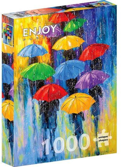 Az új technológiának köszönhetően az Enjoy Puzzle termékeknél ne aggódjon amiatt, hogy az összerakott részek szétesnek, amikor mozgatja őket, mivel a darabok szorosan és egyenletesen kapcsolódnak egymáshoz. Az aprócska puzzle darabokat bevonó sima, matt, tükröződésmentes felület minden zavaró árnyékot és oda nem illő fénylést eltűntet. Bármilyen fényviszonyok között, nappal és éjszaka is kirakható! A változatos formájú és könnyen észrevehető sajátosságok miatt a darabokat lehetetlen összetéveszteni. Az  Enjoy 1000 db-os puzzle - Rainy Day (1829) kirakó képén egy esernyős embereket láthatunk.