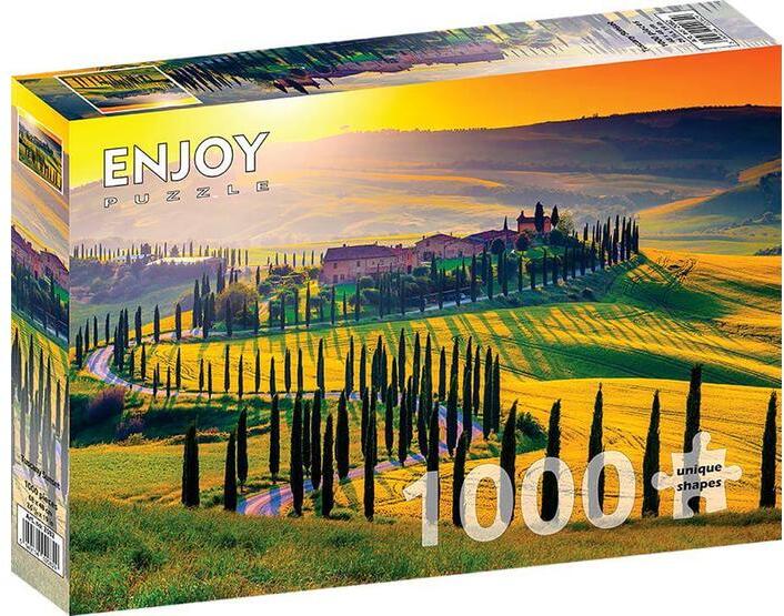 Az új technológiának köszönhetően az Enjoy Puzzle termékeknél ne aggódjon amiatt, hogy az összerakott részek szétesnek, amikor mozgatja őket, mivel a darabok szorosan és egyenletesen kapcsolódnak egymáshoz. Az aprócska puzzle darabokat bevonó sima, matt, tükröződésmentes felület minden zavaró árnyékot és oda nem illő fénylést eltűntet. Bármilyen fényviszonyok között, nappal és éjszaka is kirakható! A változatos formájú és könnyen észrevehető sajátosságok miatt a darabokat lehetetlen összetéveszteni. Enjoy 1000 db-os puzzle - Tuscany Sunset (2082) - A toszkán táj lenyűgöző szépségű, különösen a naplemente fényében. Az 1000 darabból álló puzzle a toszkán dombvidék egyik bámulatos táját örökíti meg, ahol a naplemente aranyszínű fénye áthatol a tájba és lenyűgöző látványt nyújt.