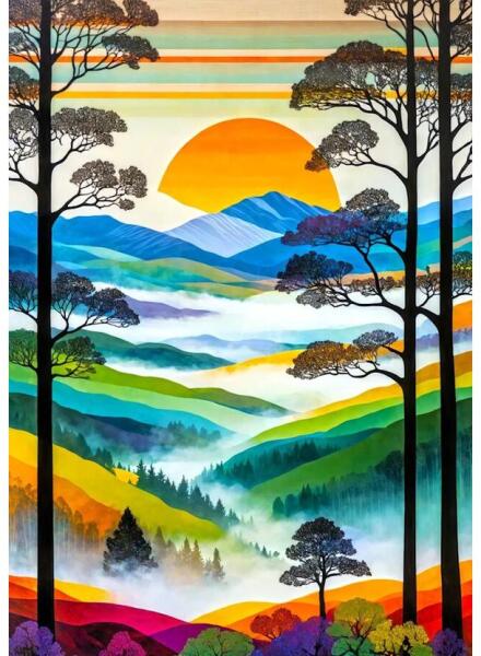 Az  Enjoy 1000 db-os puzzle - Hilltops Breeze (2264) című képen a színes hegyek és fekete fák kontrasztjának kellemes kompozícióját láthatjuk.
