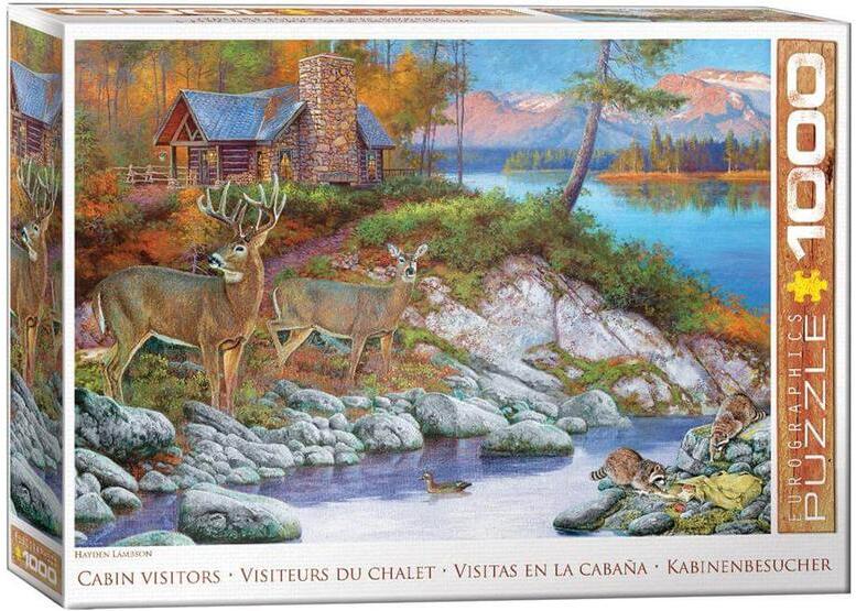 Az új technológiának köszönhetően a puzzle  Smart cut vágással készült, ami izgalmasabb kirakást nyújt.  Az EuroGraphics 1000 db-os puzzle - Cabin Visitors by Hayden Lambson  kirakó képén egy hangulatos hegyi nyaraló látható, erdő, hegyek és egy folyó. ELőtérben pedig a kíváncsi állatok, szarvasok és mosómedvék.