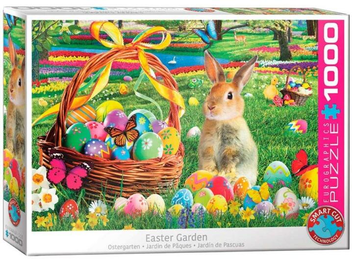 Az EuroGraphics 1000 db-os puzzle - Easter garden  című képe meghitt húsvéti hangulatot áraszt a kertben összegyűjtött kosárnyi hímes tojással és kisállatokkal. Az EuroGraphics gyártó nagy figyelmet fordít a környezettudatos működésre, úgy a termékeik előállításánál, mint a dolgozóik környezetbarát gondolkodásra való ösztönzésénél.