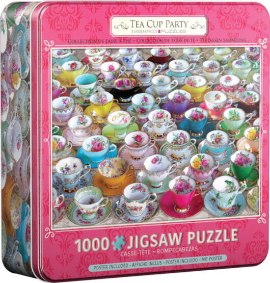 Az Eurographics 1000 db-os puzzle fém dobozban - Tea Cup Party című képen művészien elkészített teás csészék találhatóak.  Az 1000 db-os puzzle fém dobozban tárolható, a doboz poszter képet tartalmaz. Az Eurographics gyártó nagy figyelmet fordít a környezettudatos működésre, úgy a termékeik előállításánál, mint a dolgozóik környezetbarát gondolkodásra való ösztönzésénél. Tegyünk érte, hogy ezeket a lenyűgöző helyeket megőrizzük a jövő generációi számára!Az új technológiának köszönhetően a puzzle  Smart cut vágással készült, ami izgalmasabb kirakást nyújt.