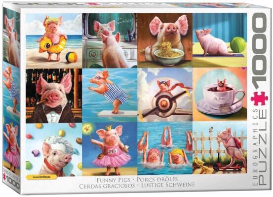 Az EuroGraphics 1000 db-os puzzle - Funny Pigs, Lucia Heffernan (6000-5770) Lucia Heffernan művész szeszélyes és gyakran humoros disznóművészeti képeinek kollázsgyűjteménye. Amikor a Pigs Fly, High Roller, I'm Beautiful és más népszerű képek szerepelnek.