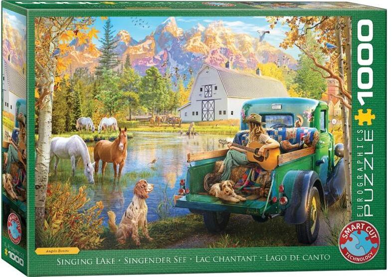 Az EuroGraphics 1000 db-os puzzle - Singing Lake  Angelo Bonito alkotása, kanadai idill a hegyekben: kutyák, lovak és egy gitáros a tó partján.