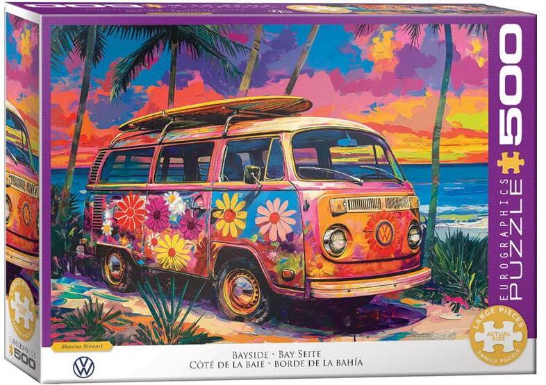 Az EuroGraphics 500 db-os puzzle - Bayside  Shawna Stewart alkotása. A képen egy emblematikus, virágokkal díszített Volkswagen kisbuszt látunk a tengerparton. Ha egy kis hippie életérzésre vágysz, ez a kirakó épp megfelelő választás! A nagy, könnyen kezelhető darabok minden korosztály számára önfeledt élményt nyújtanak.