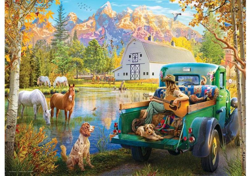 Az EuroGraphics 1000 db-os puzzle - Singing Lake  Angelo Bonito alkotása, kanadai idill a hegyekben: kutyák, lovak és egy gitáros a tó partján.
