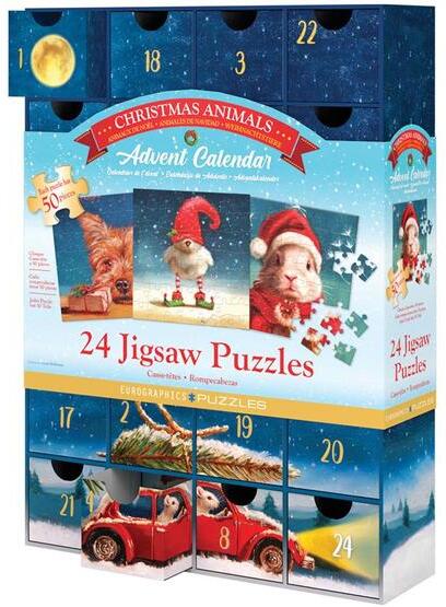Az EuroGraphics Adventi kalendárium puzzle - Funny X-mas  igazán izgalmassá teszi a Karácsony előtti adventi időszakot! A várakozás rövidebbnek tűnik majd, ha naponta egy-egy új meglepetés kirakót fedezhetsz fel! Nincs más dolgod, mint minden nap kinyitni egy dobozkát, melyben 50 db-os mini puzzle vár mókás kis állatokkal. A dobozkák hátoldalán találod meg a kirakók képét.  Az Eurographics gyártó nagy figyelmet fordít a környezettudatos működésre, úgy a termékeik előállításánál, mint a dolgozóik környezetbarát gondolkodásra való ösztönzésénél. Tegyünk érte, hogy ezeket a lenyűgöző helyeket megőrizzük a jövő generációi számára!
