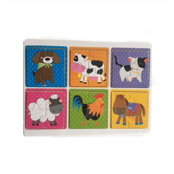 A fa állatos kirakó szett tökéletes választás a legkisebbek számára, hogy játék közben fejlődjön a kézügyességük és megfigyelőképességük. A szett 6 különböző, színes háttérrel ellátott állatfigurát tartalmaz: kutyát, tehenet, cicát, bárányt, kakast és lovat. Minden állat külön kis kirakóként működik, 4 darabból áll, így a kisebb gyermekek számára is könnyedén összeilleszthető. A vidám, kontrasztos színek és a barátságos minták ösztönzik a gyerekeket a játékra és tanulásra. Ideális 1 éves kortól, hogy a kicsik játékosan ismerkedhessenek meg a háziállatokkal, miközben fejlesztik a szem-kéz koordinációt és a logikai gondolkodást.