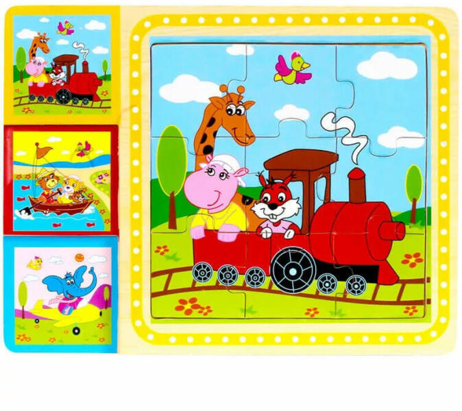 3 x 9 db-os fa puzzle 3 különböző képpel. Rakd össze a képet a darabokból. A puzzle játékok nem csak fejlesztik a memóriát, a megfigyelő és koncentrációs képességet, de türelemre és kitartásra is tanítanak. A képek mérete 25 x 19 cm...